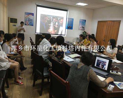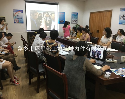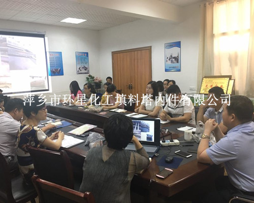 (萍乡市环星化工填料塔内件厂)全体管理人员在会议室听总经理分享游学后感