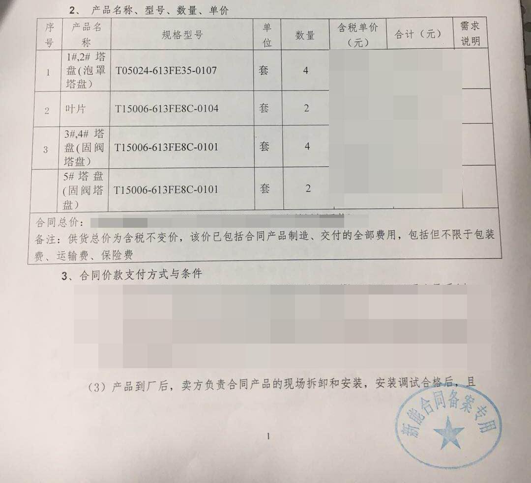 山东滕州某能源公司与我公司(江西省萍乡市环星化工填料塔内件有限公司)签订10套固阀塔盘、浮阀塔盘合同。客户是用于甲醇气化装置项目。材质:316L,直径:3400mm。合同明细如下: