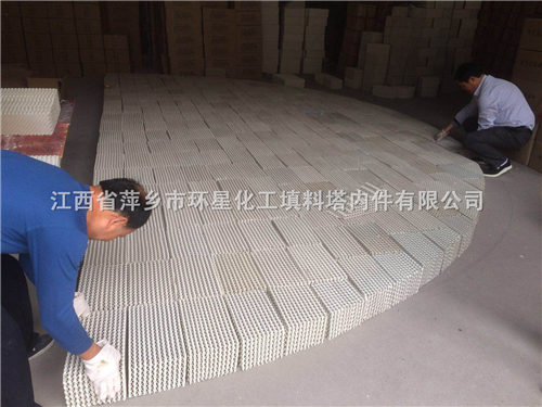 我公司(萍乡市环星化工填料塔内件有限公司)车间正在生产:350Y瓷质波纹板填料也叫陶瓷孔板波纹填料或者轻瓷质波纹板填料等。下面给大家介绍下这种陶瓷规整波纹填料产品。